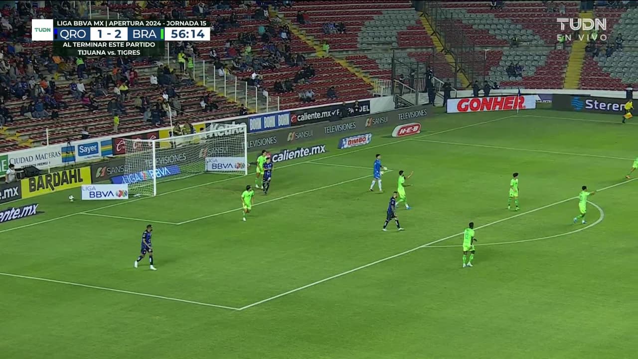 Darío Benedetto (Querétaro) remata palo| disparo de cabeza desde el centro del área.