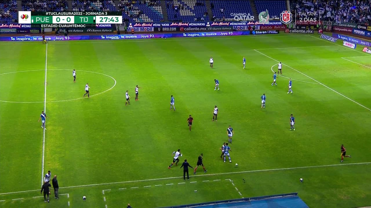 ¡Penalti fallado! Puebla 0| Club Tijuana 0. Diego de Buen (Puebla) remata al poste izquierdo| Disparo con la derecha.