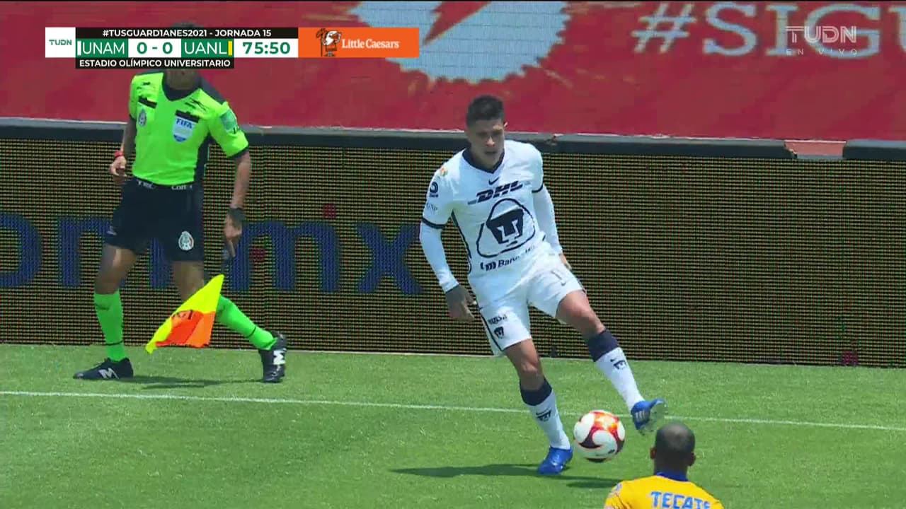 Diego Reyes (Tigres) remata al travesaño| disparo de cabeza desde el centro del área. Asistencia de Leonardo Fernández con un centro al área tras un saque de esquina.