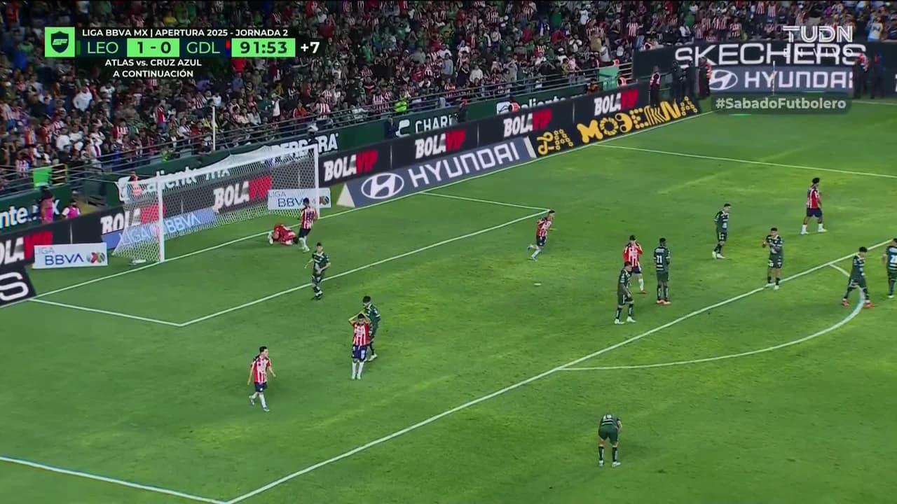 Efraín Álvarez (Chivas ) remata al travesaño| Disparo con la derecha desde fuera del área. Asistencia de Daniel Aguirre.