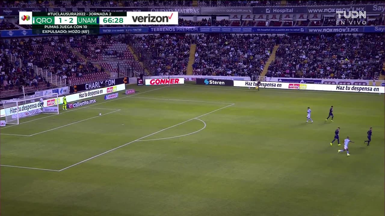 Enzo Martínez (Querétaro) remata palo| disparo de cabeza desde el lado izquierdo dentro del área tras el cobro de una falta.