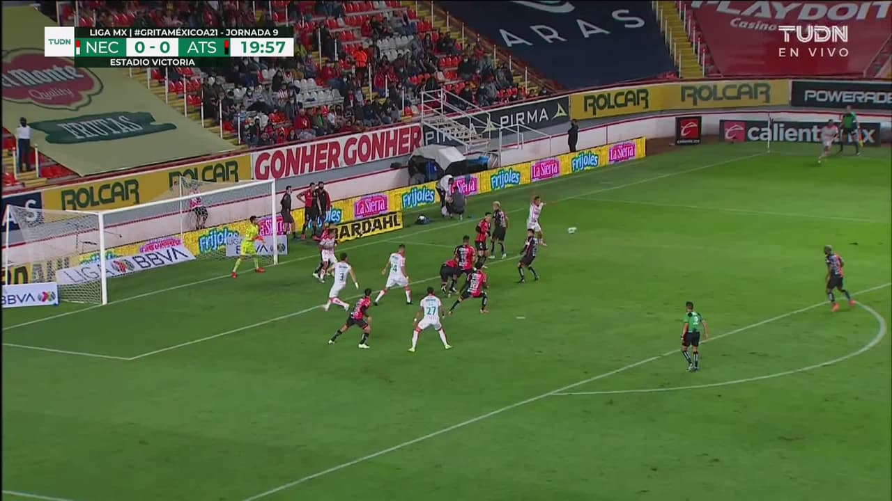 Fernando González (Necaxa) remata poste| remate con la derecha desde fuera del área tras un saque de esquina.