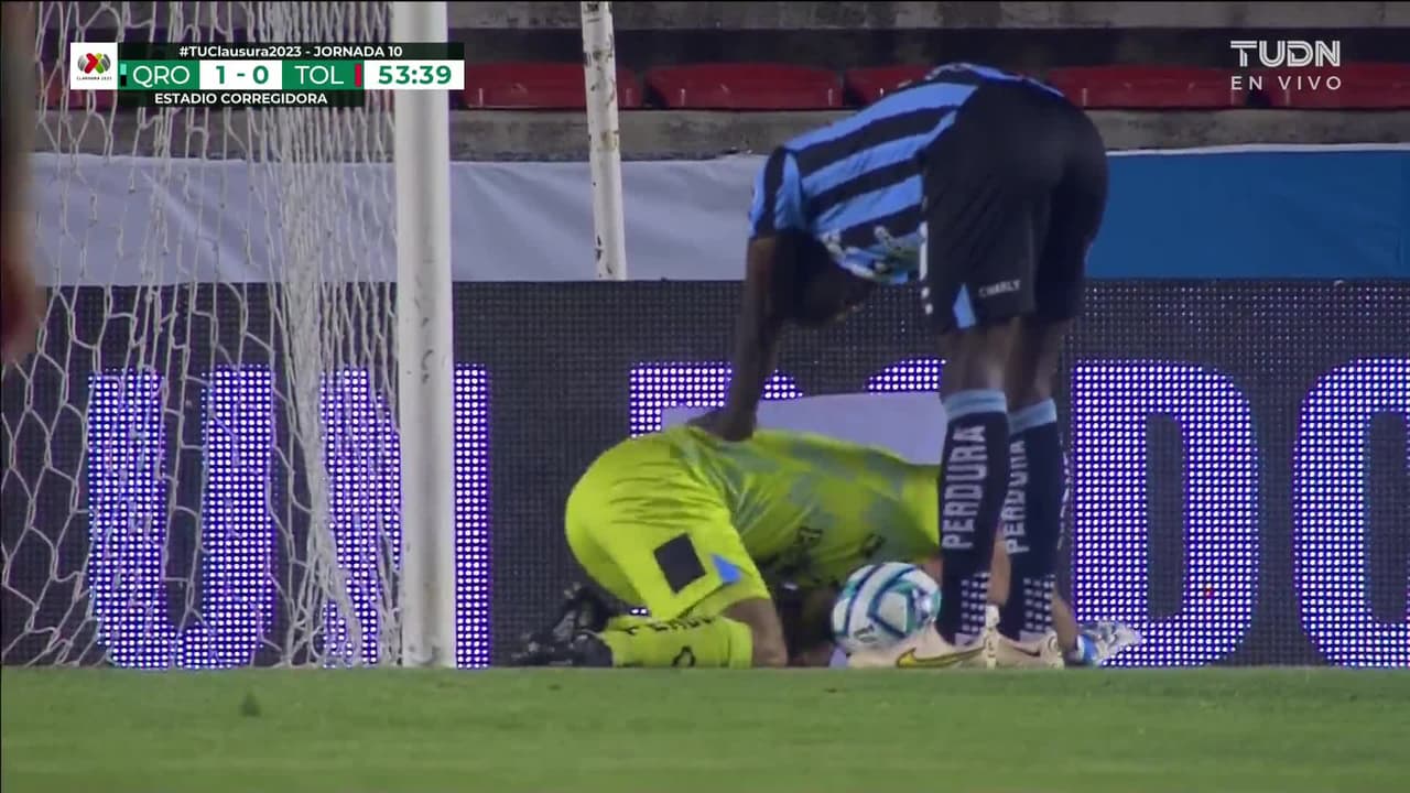 Fernando Navarro (Toluca) remata al poste derecho| Disparo con la derecha desde el centro del área.
