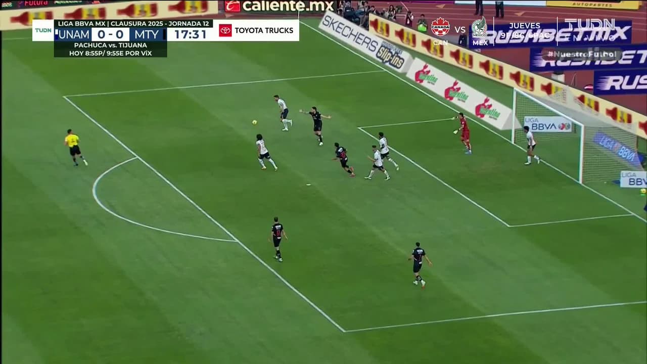 Germán Berterame (Monterrey) remata al poste izquierdo| Disparo con la derecha desde fuera del área.