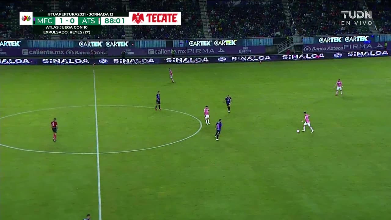 Giovanni Augusto (Mazatlán FC) remata al travesaño| zurdazo desde el centro del área. Asistencia de Nicolás Vikonis pase largo.