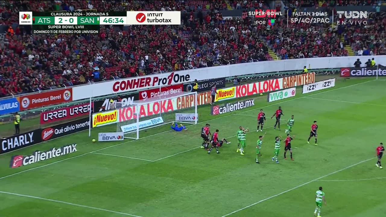 Harold Preciado (Santos Laguna) remata al travesaño| disparo de cabeza desde el centro del área. Asistencia de Jordán Carrillo con un centro al área tras un saque de esquina.