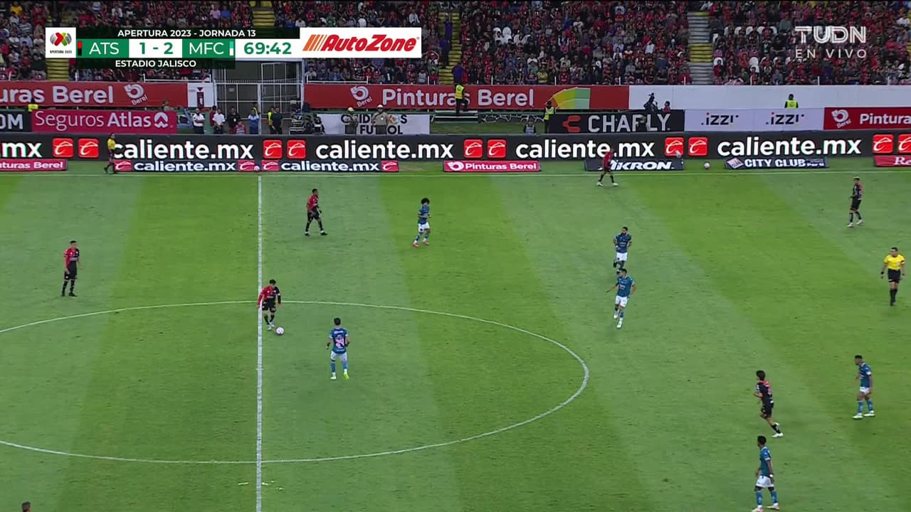 Israel Larios (Atlas) remata al travesaño| disparo de cabeza desde el centro del área. Asistencia de Luis Reyes con un centro al área.