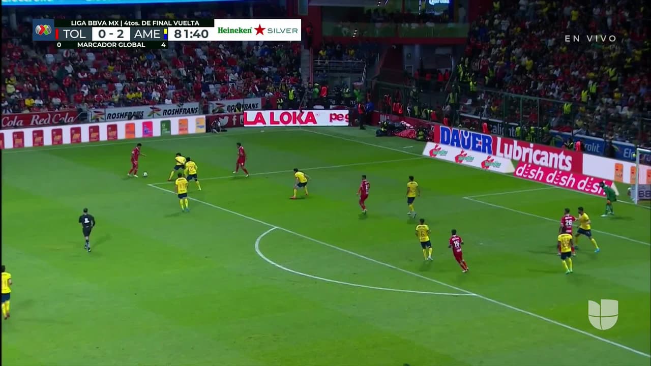 Jesús Gallardo (Toluca) remata palo| zurdazo desde el lado izquierdo dentro del área.