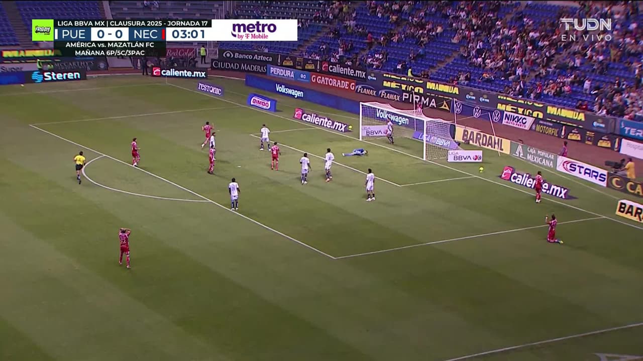 Johan Rojas (Necaxa) remata al travesaño| Disparo con la derecha desde fuera del área. Asistencia de Kevin Rosero.