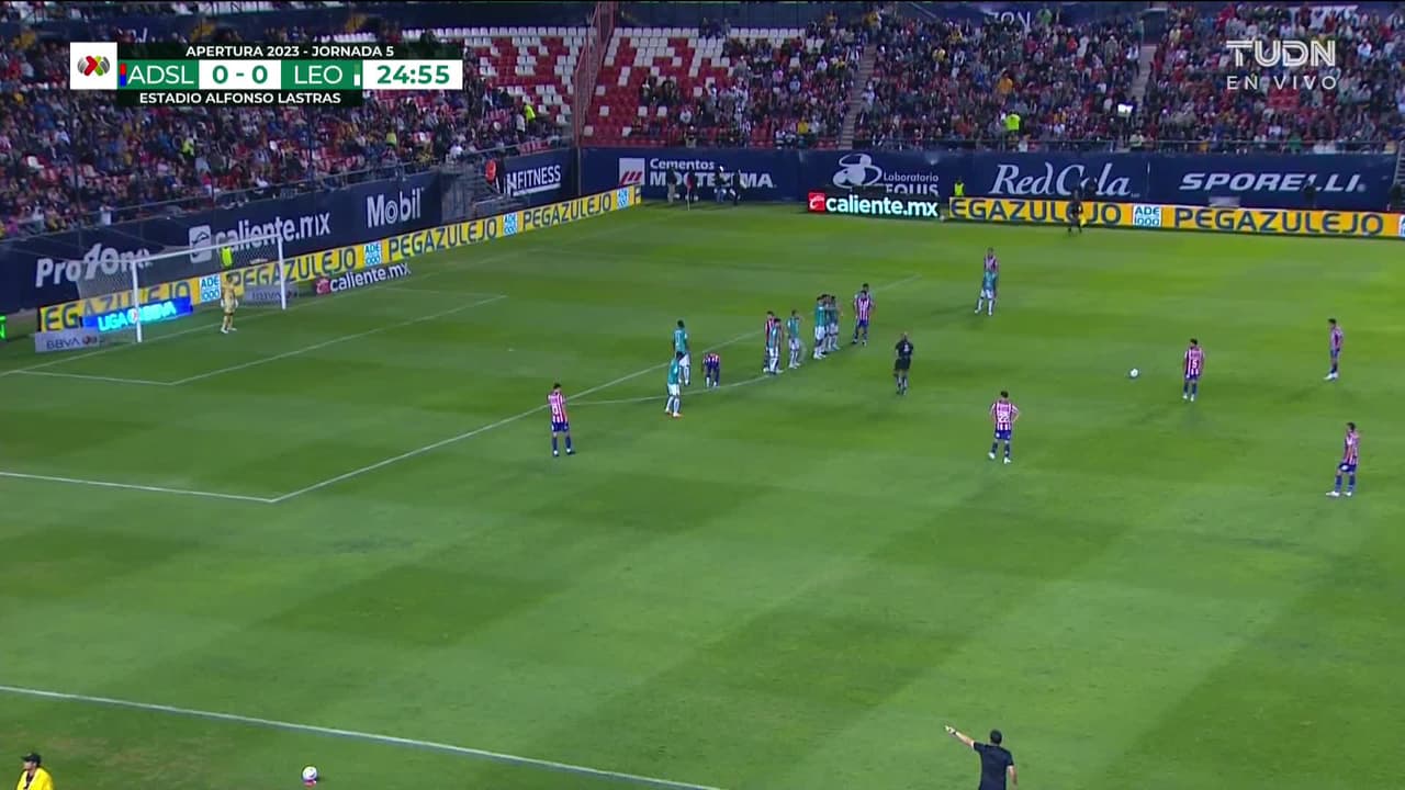 Juan Manuel Sanabria (Atlético San Luis) remata palo| zurdazo desde fuera del área de tiro libre directo.
