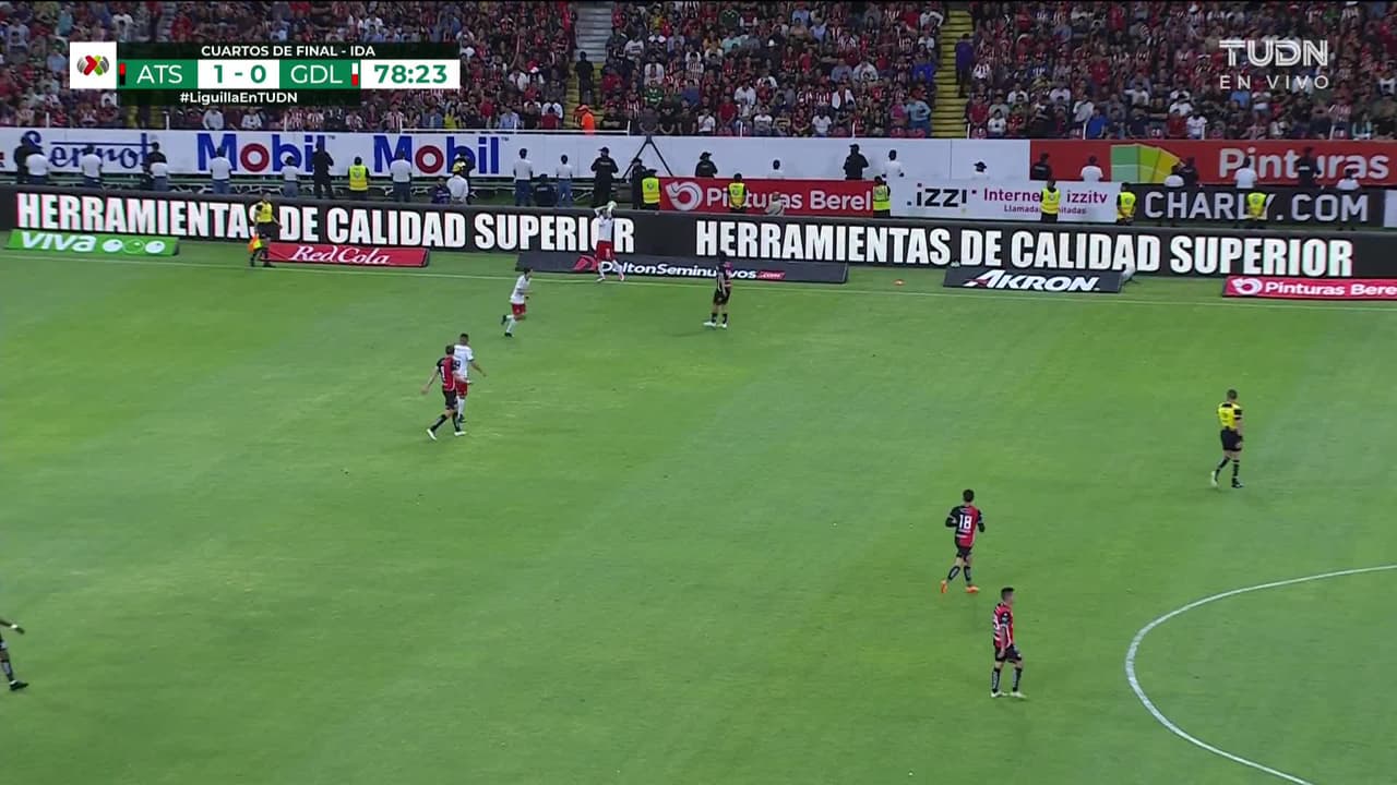 Julián Quiñones (Atlas) remata palo| Disparo con la derecha desde fuera del área.