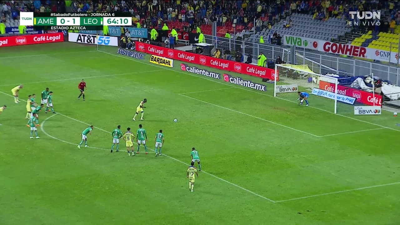 Julián Quiñones (América) remata palo| Disparo con la derecha desde el centro del área.