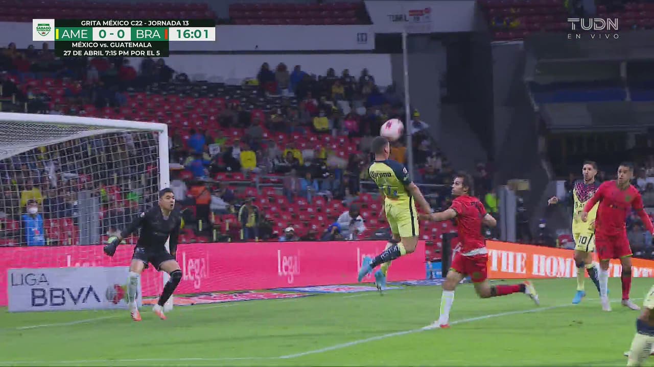 El delantero del América remata en el área sin marca, pero no pudo concretar la anotación, al 16'.