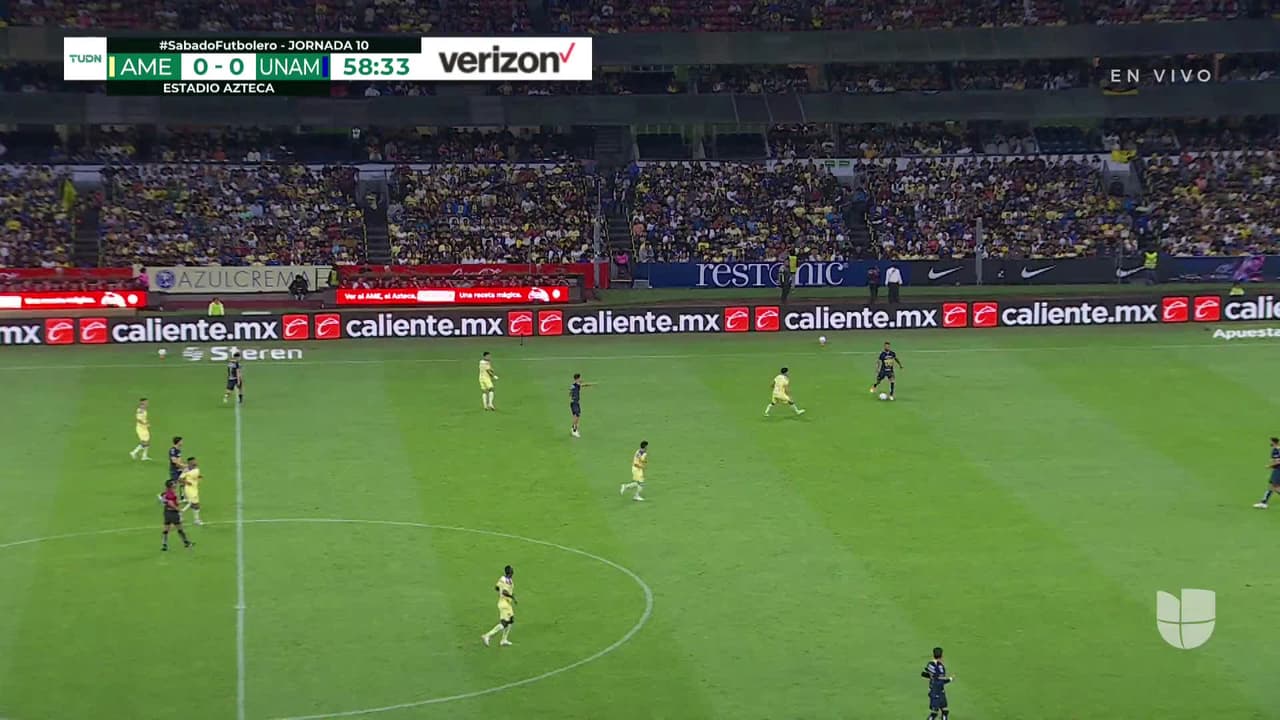 Leo Suárez (América) remata palo| zurdazo desde fuera del área.