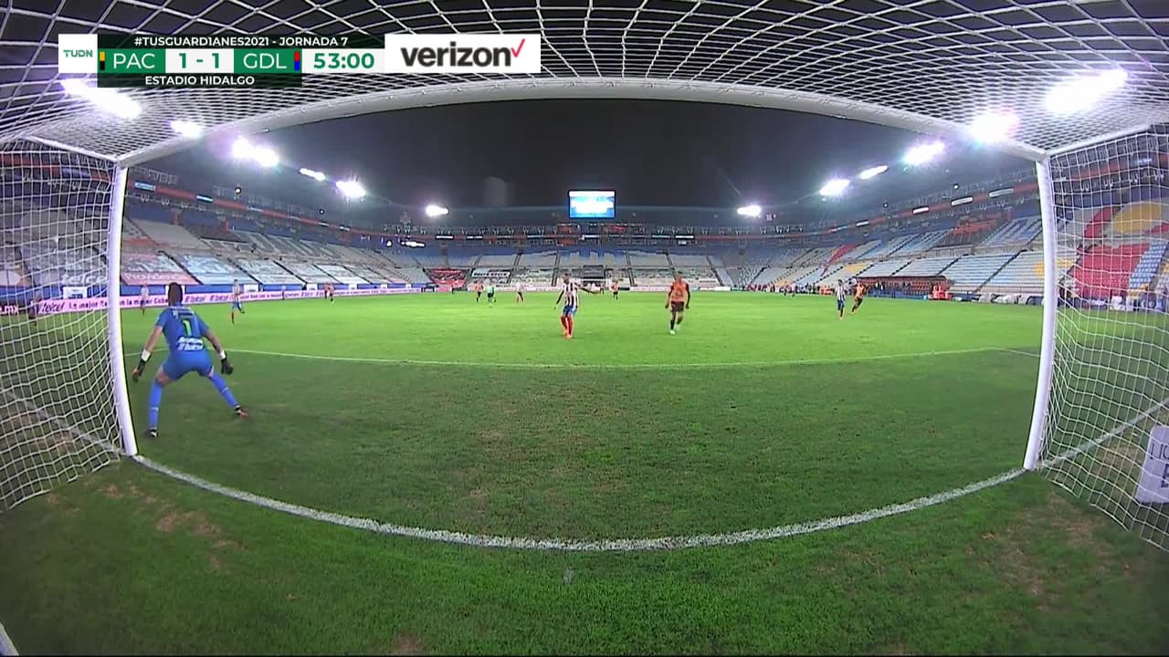 Mauro Quiroga (Pachuca) remata al poste izquierdo| disparo de cabeza a quemarropa desde el lado izquierdo.