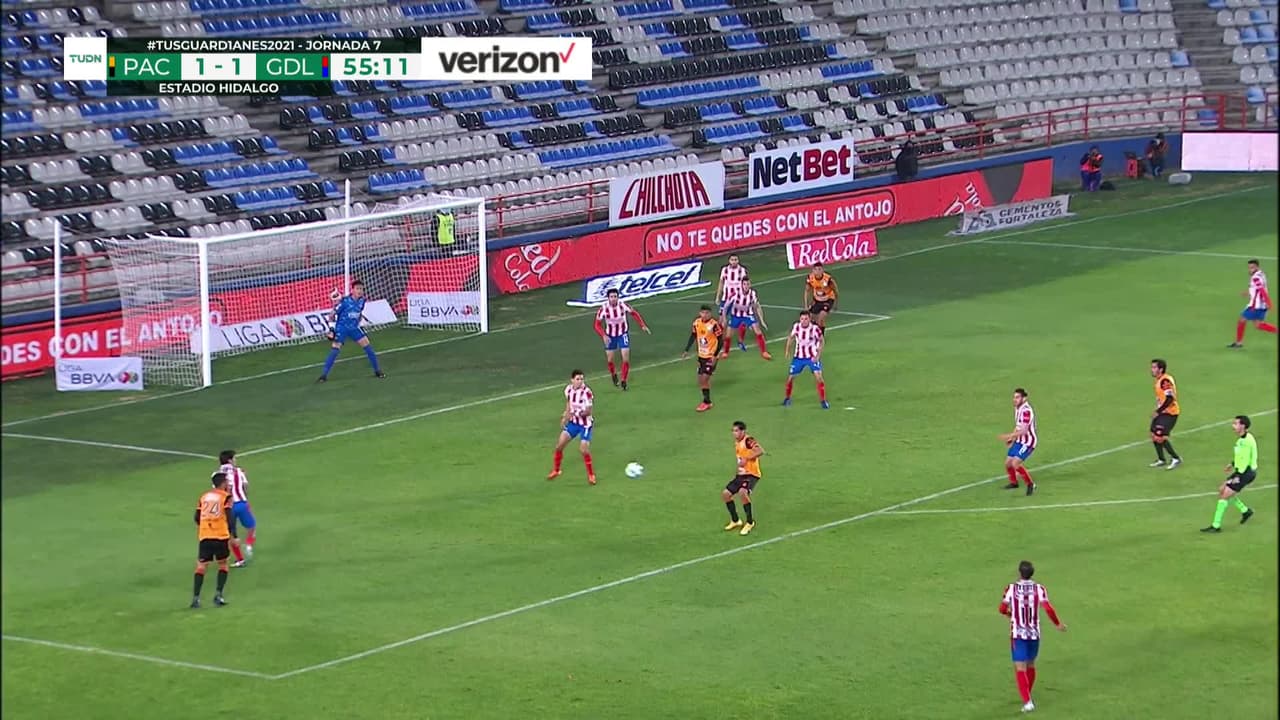 Mauro Quiroga (Pachuca) remata al travesaño| disparo de cabeza desde el centro del área. Asistencia de Francisco Figueroa con un centro al área.