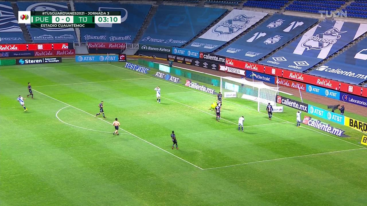 Omar Fernández (Puebla) remata al poste izquierdo| Disparo con la derecha desde el centro del área. Asistencia de Maximiliano Araujo.