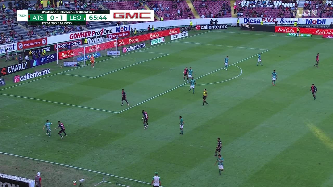 Ozziel Herrera (Atlas) remata al travesaño| Disparo con la derecha desde el lado derecho dentro del área. Asistencia de Julián Quiñones.