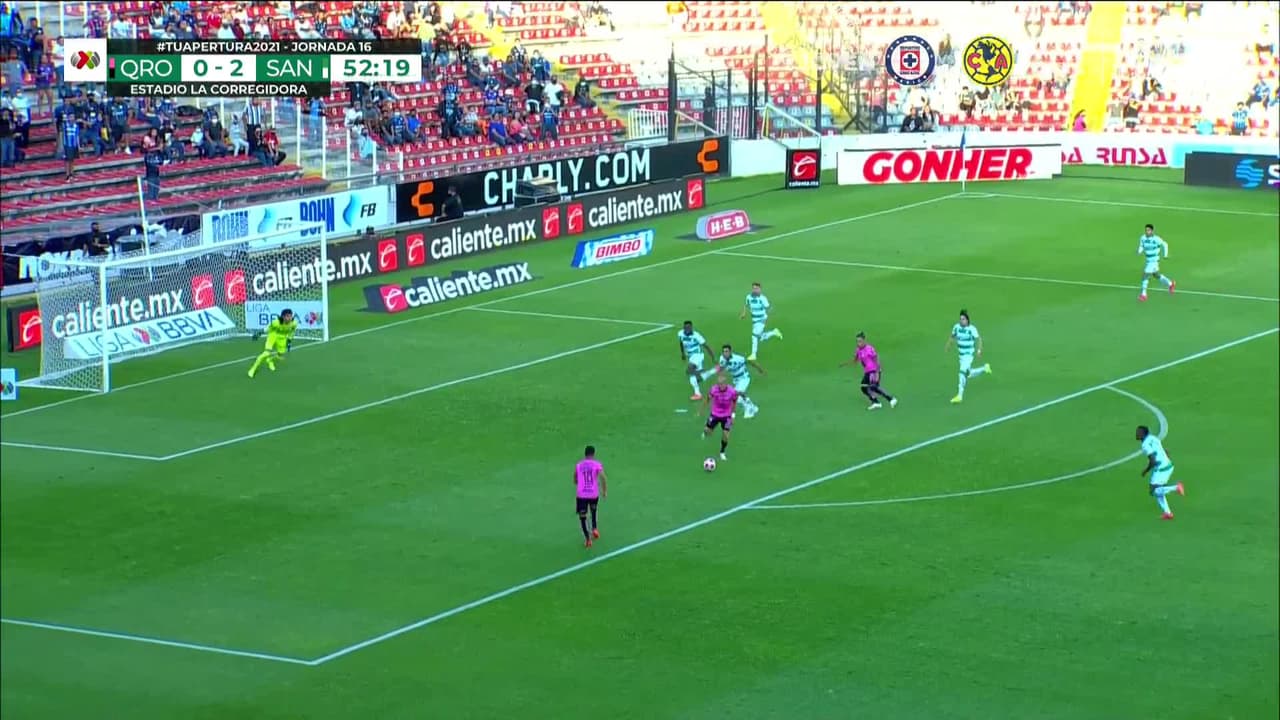 Pablo Barrera (Querétaro) remata al travesaño| Disparo con la derecha desde el centro del área. Asistencia de Jonathan Dos Santos.