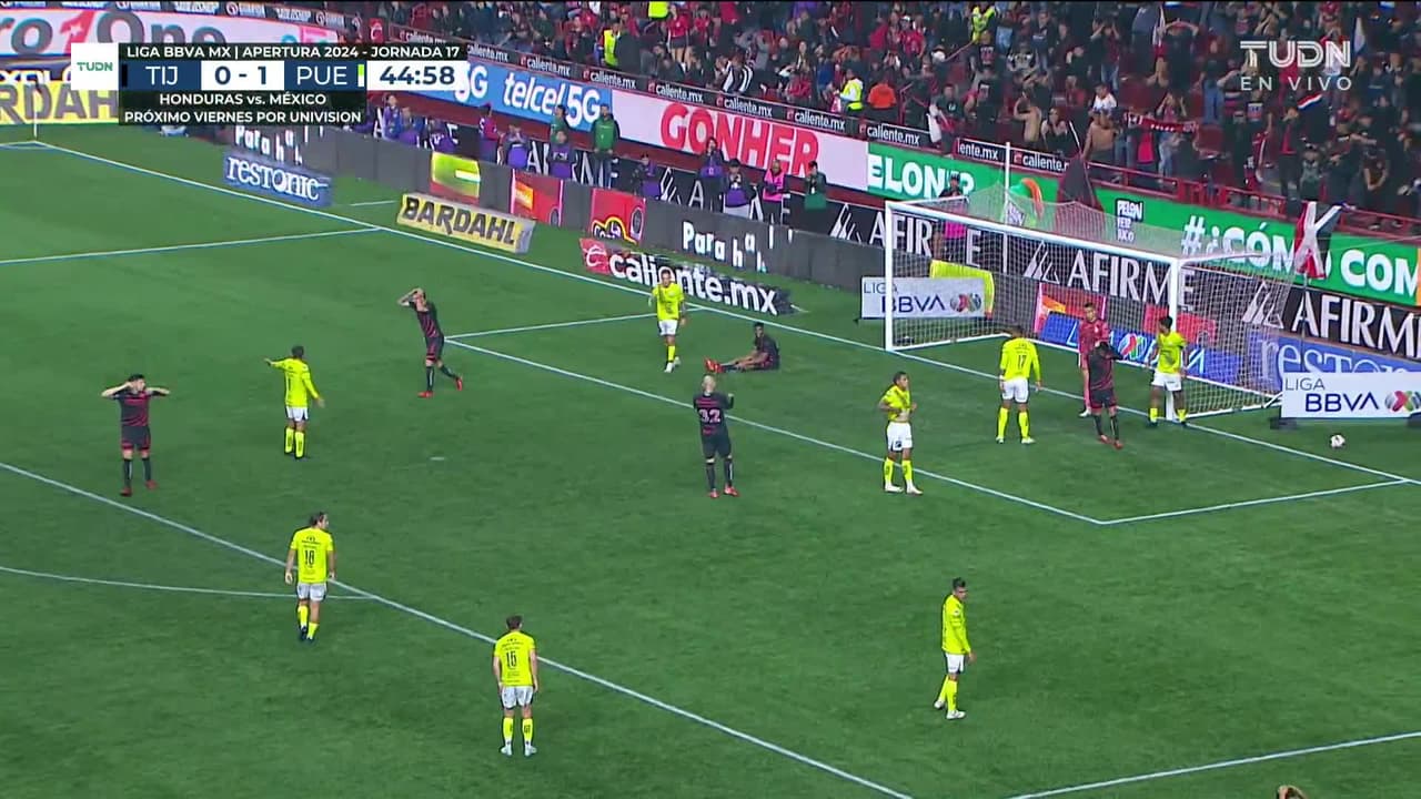 Raúl Zúñiga (Club Tijuana) remata al poste derecho| disparo de cabeza a quemarropa desde el lado izquierdo. Asistencia de Carlos González con un pase de cabeza.