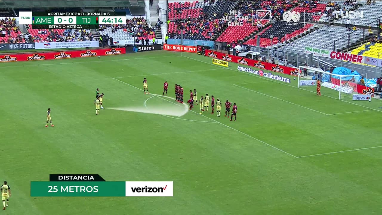 Richard Sánchez (América) remata palo| Disparo con la derecha desde fuera del área de tiro libre directo.