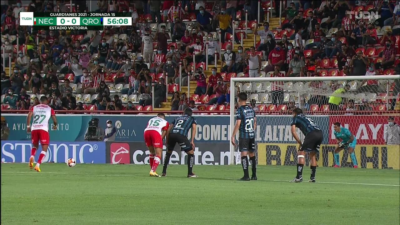 Rodrigo Aguirre (Necaxa) remata palo| zurdazo desde el centro del área.