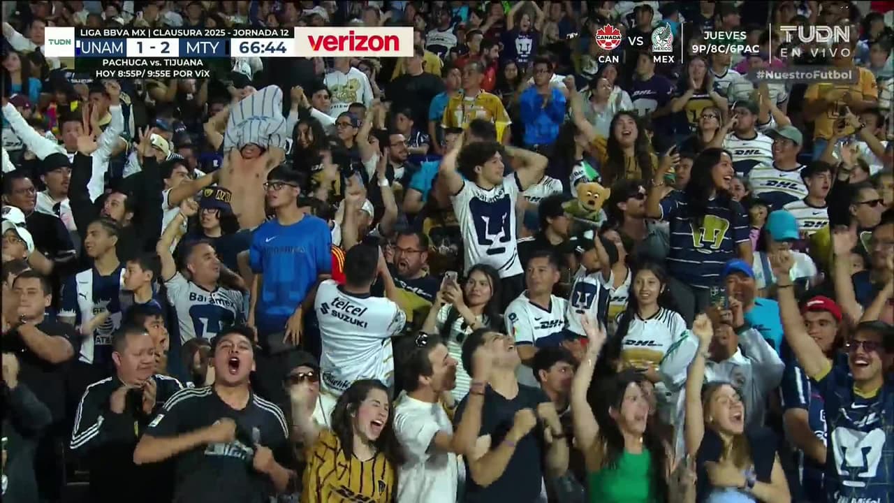 Rubén Duarte (Pumas UNAM) remata al poste derecho| con un tiro desde muy cerca. Asistencia de Lisandro Magallán tras un saque de esquina.