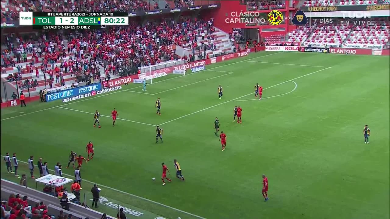 Rubens Sambueza (Toluca) remata al larguero| remate con la izquierda desde fuera del área. Asistencia de Claudio Baeza.