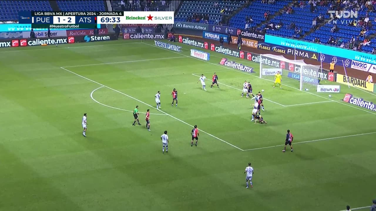 Santiago Ormeño (Puebla) remata al poste derecho| Disparo con la derecha desde fuera del área. Asistencia de Raúl Castillo.