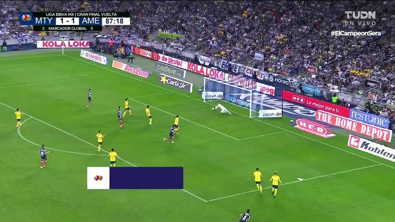 Sebastián Vegas (Monterrey) remata al travesaño| disparo de cabeza desde muy cerca. Asistencia de Sergio Canales con un centro al área tras un saque de esquina.