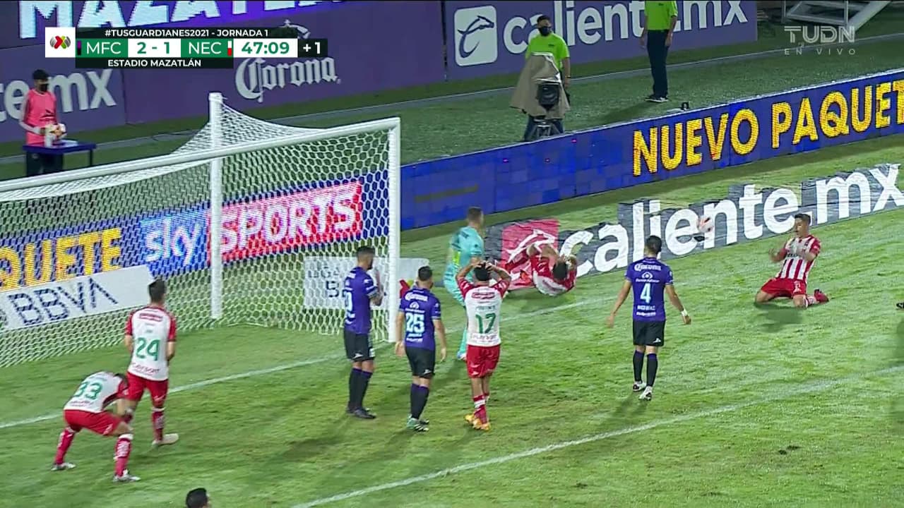 Unai Bilbao (Necaxa) remata al poste derecho| zurdazo a quemarropa desde el lado derecho tras un saque de esquina.