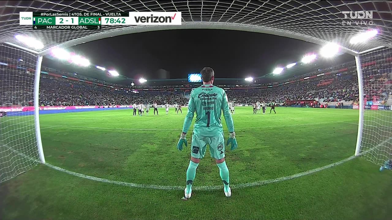 ¡Penalti fallado! Pachuca 2| Atlético San Luis 1. Víctor Guzmán (Pachuca) remata al poste derecho| Disparo con la derecha.