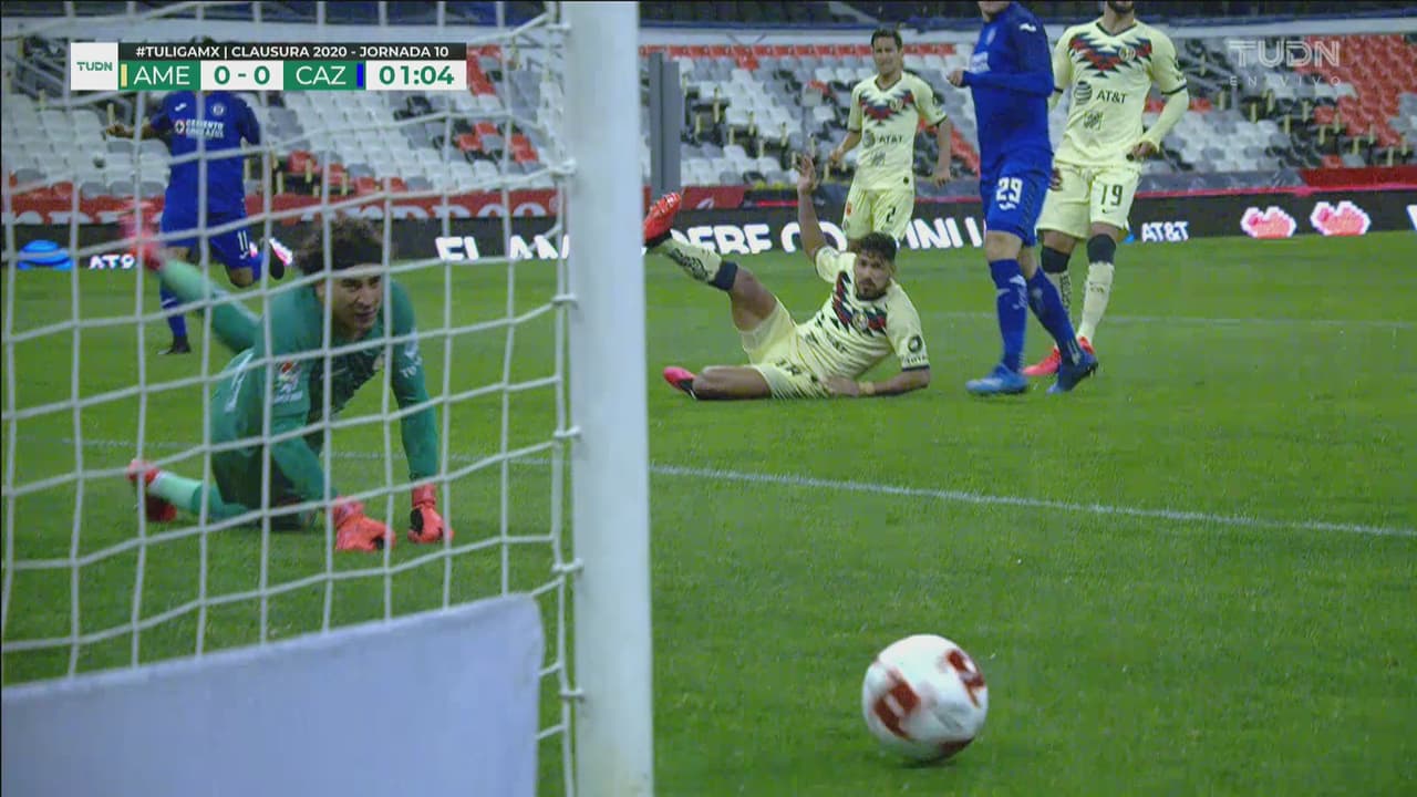 Balón filtrado de Orbelín Pineda para Giménez, quien estaba ante Ochoa, pero cruzó su tiro.