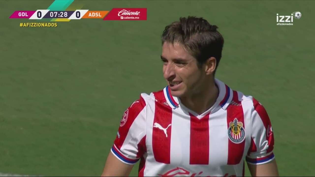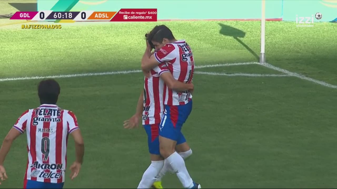 Chivas tuvo más empuje y posesión de balón, fiel al estilo que Vucetich imprime en sus equipos. Fue así como Macías era liberado por los movimientos de Antuna y Brizuela, que le dieron el espacio para sacar un disparo que pasó apenas a un lado del poste. El arquero de San Luis se estiró pero no tocó el esférico.