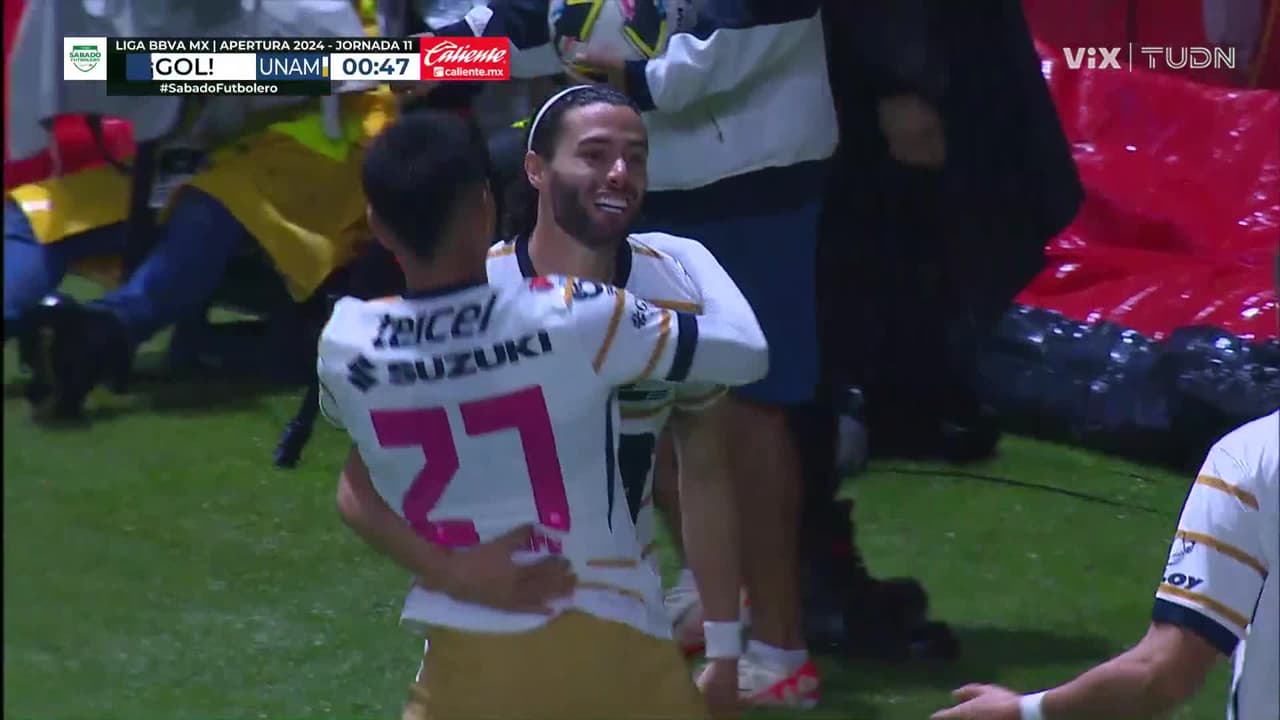 El portero de Pumas pudo hacer más, pero solo alcanzó a arrodillarse, aunque se desconoce si fue porque no se esperaba el disparo o porque su defensa le bloqueaba la vista.