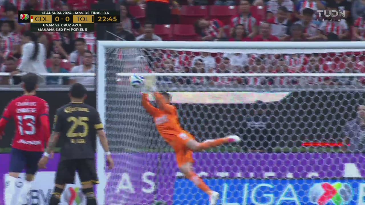 Alexis Vega sacó disparo desde fuera del área que llega a las manos de 'Tala' Rangel sin peligro alguno.