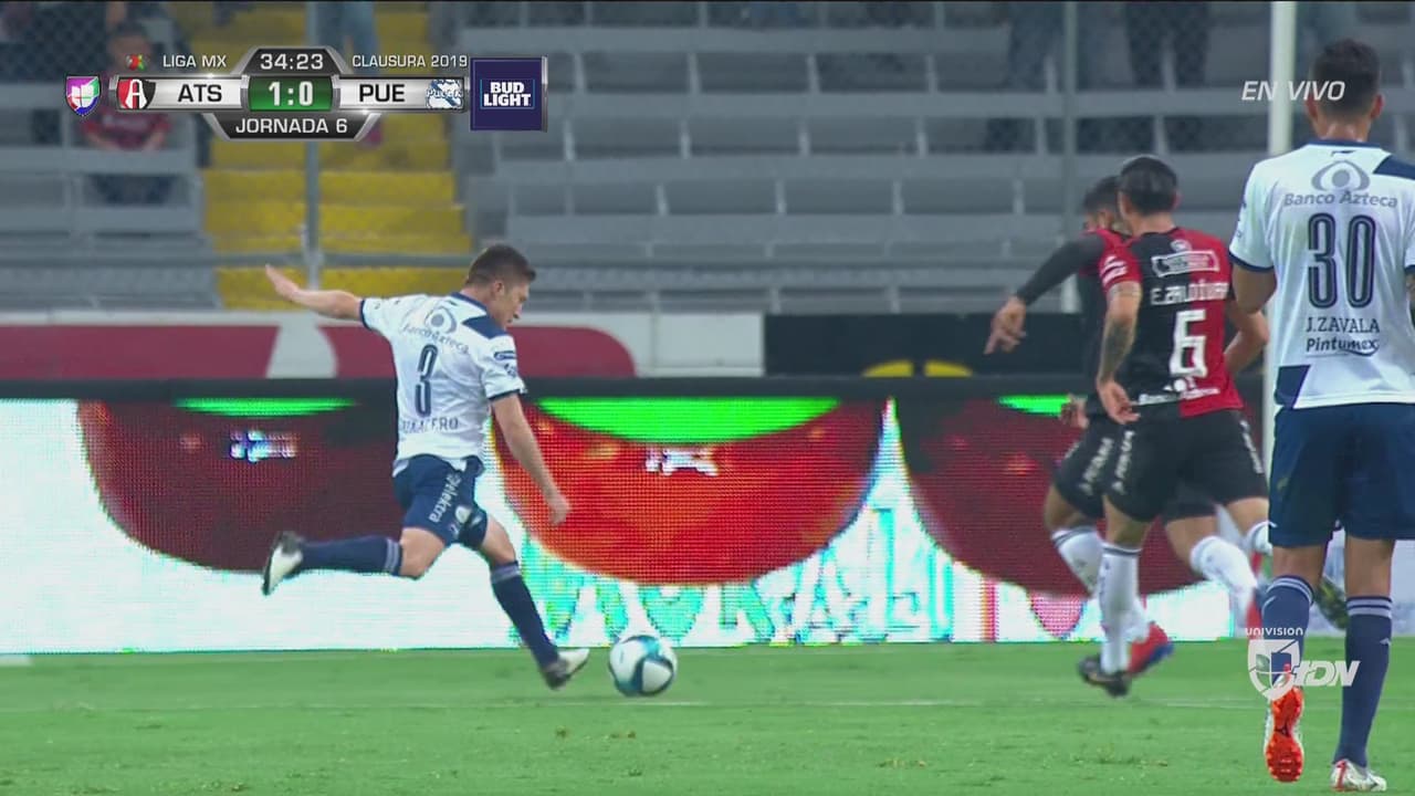 Puebla quiere igualar el marcador antes del medio tiempo, pero el boliviano no logra aprovechar la posición y pone el esférico fuera del primer palo.