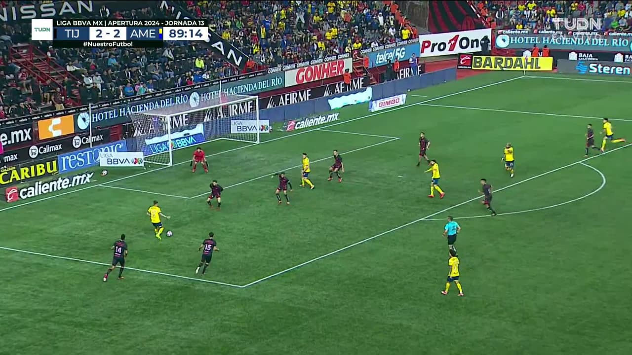 Tiro atajado raso al centro del arco. Brian Rodríguez (América) Disparo con la derecha desde el lado izquierdo dentro del área. Asistencia de Álex Zendejas.