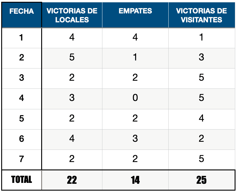 De los 61 cotejos efectuados hasta este instante, los equipos que han jugado fuera de casa acumulan 25 victorias, comparado con 22 triunfos para los locales y 14 empates.