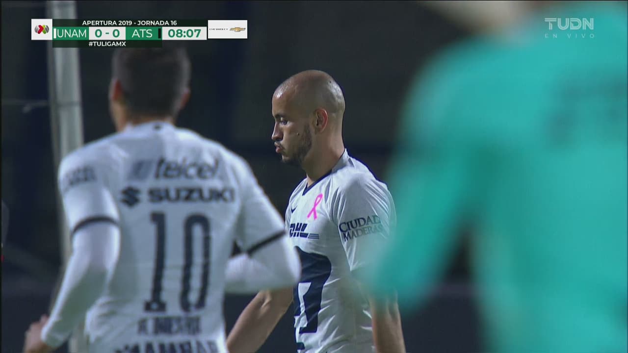 Recorte dentro del área del delantero de los Pumas, pero el portero del Atlas desvía al 8’.