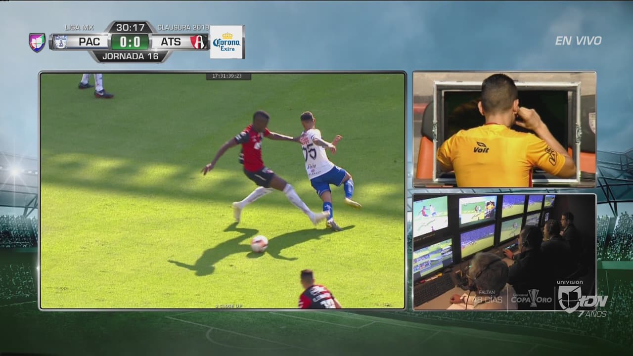 El protagonista del primer tiempo no fue Pachuca, ni Atlas, ni el futbol, sino el VAR, que se apareció tres veces en menos de 30 minutos. El árbitro recurrió al él al 6' para expulsar al 'Rifle' Andrade debido a una 'plancha' sobre Jorge Hernández, al 22' para anularle un gol al Pachuca por una supuesta mano del 'burrito' a ntes de la anotación y al 30' para dejar al Atlas con 9, expulsado a Jorge Segura por un pisotón a Víctor Guzmán.