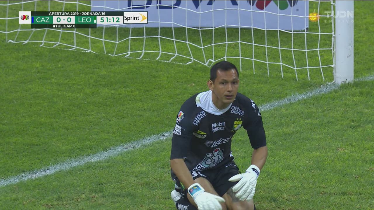 El mediocampista de La Máquina queda solo en el área e intenta sorprender con un 'globito' al arquero del León que se estira al máximo para evitar el gol.