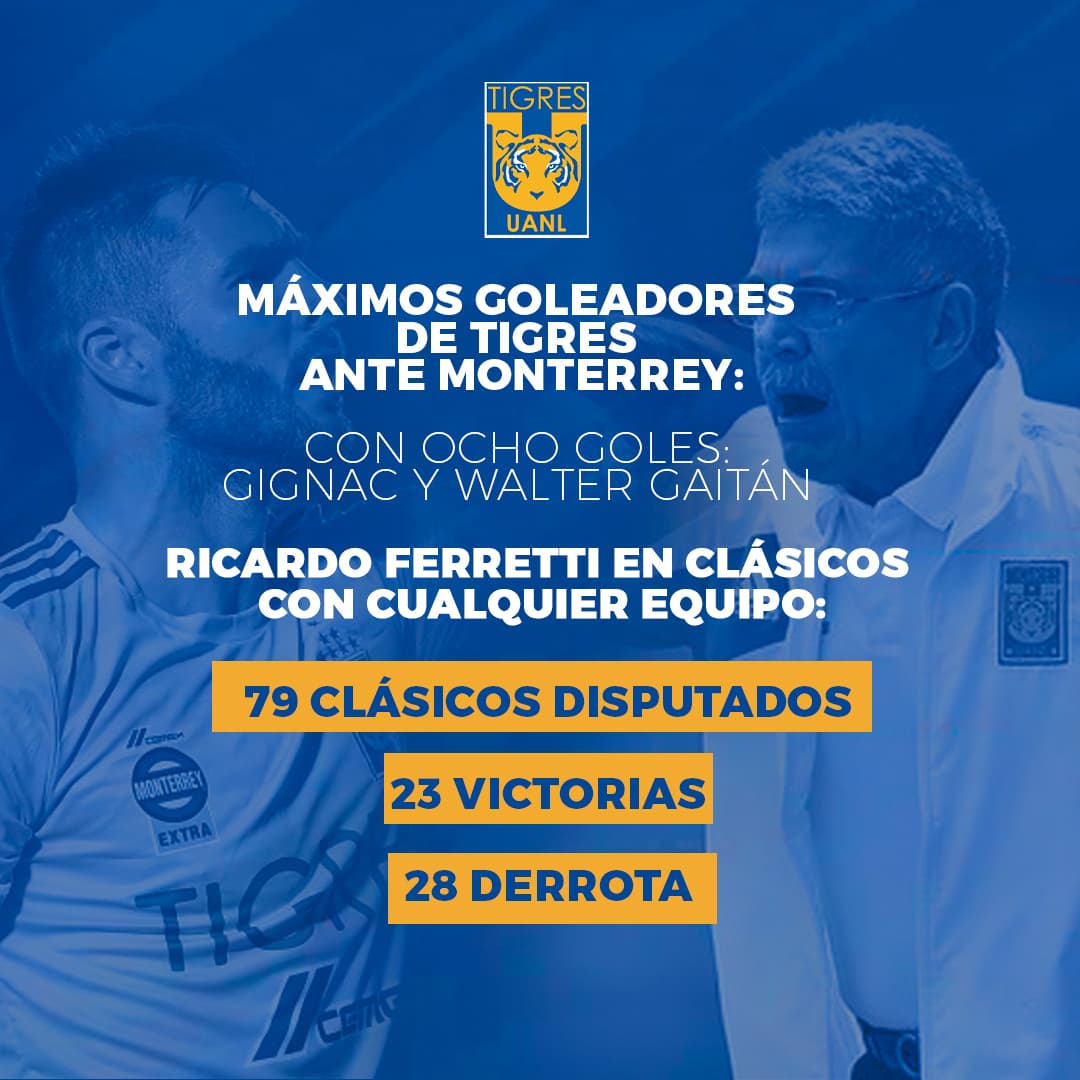 Para el Clásico Regio, Gignac puede convertirse en el máximo goleador de Tigres contra Monterrey, con ocho tantos está igualado con Walter Gaitán, mientras Ricardo Ferretti llegará a 79 Clásicos con todos los equipos dirigidos, pero apenas registra 23 victorias por 28 derrotas.