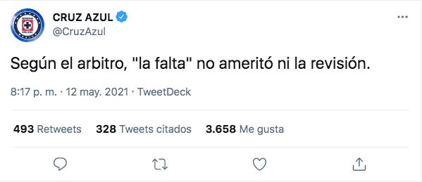 Lo que más molestó a La Máquina fue que no se recurriera al VAR para revisar la decisión y corroborar que en realidad hubiera una falta, por lo que el conjunto celeste hizo uso de las redes sociales como recurso para expresar la injusticia de la que era víctima.