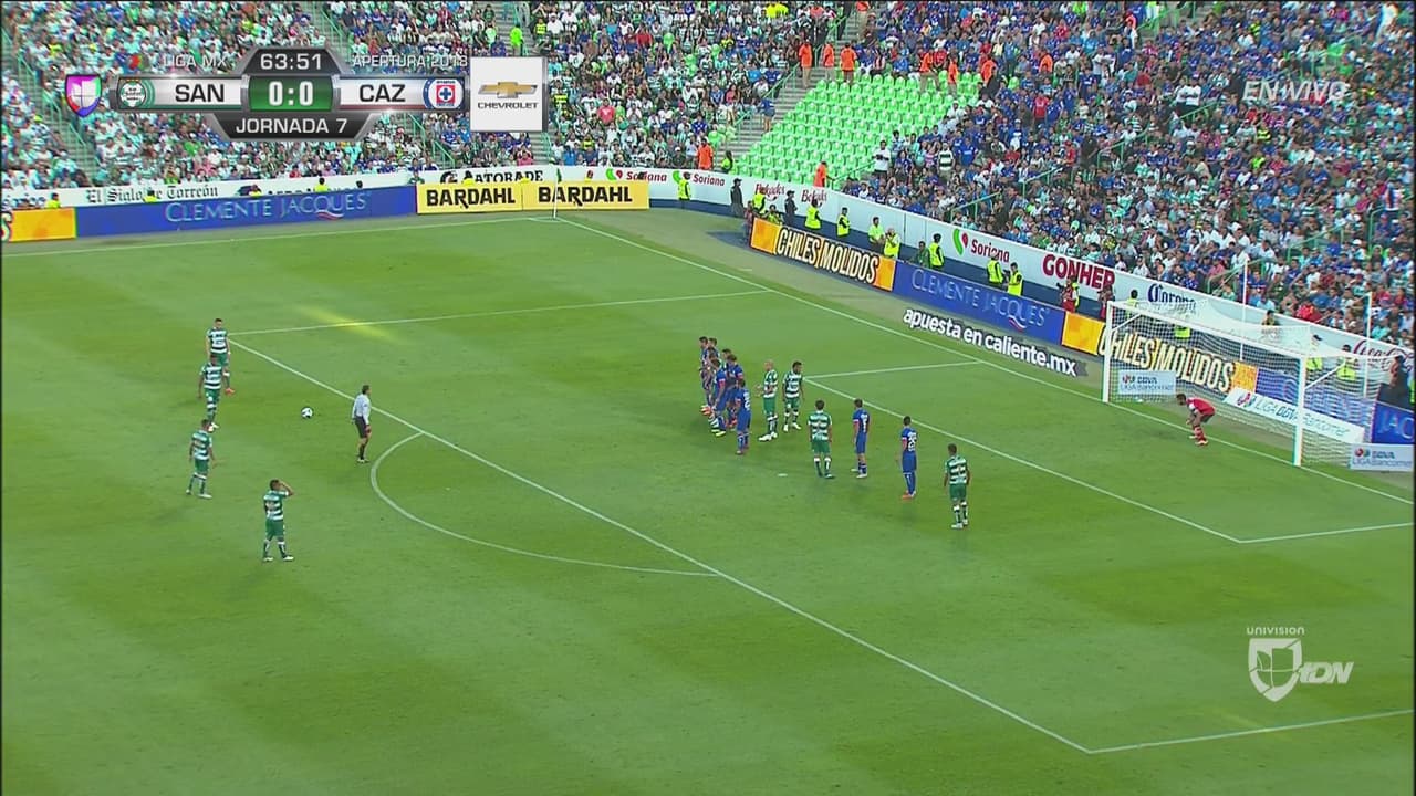 Jonathan Rodríguez ejecuta tiro libre con fuerza y el esférico pasa muy cerca del arco celeste.