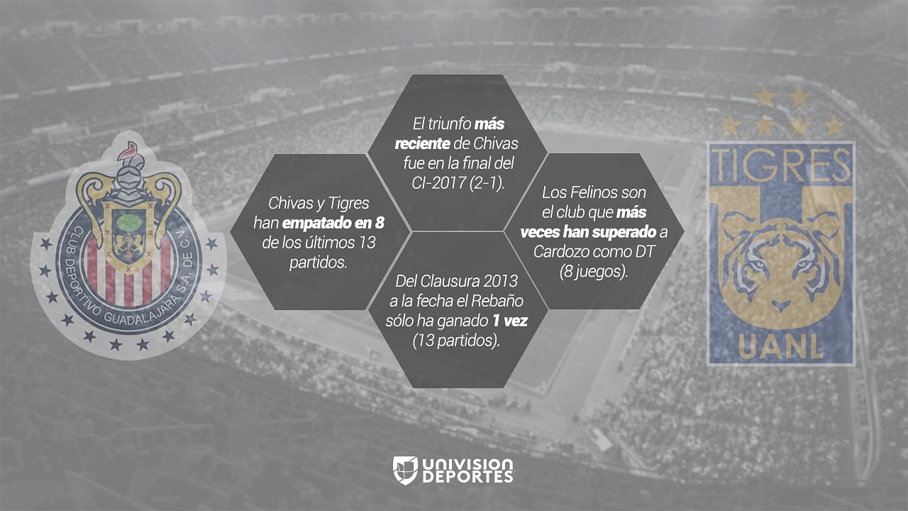 En el caso de Tigres, que enfrentará a Chivas como visitante, las estadísticas le favorecen. Los felinos del 'Tuca' Ferretti son el equipo que más veces ha pasado por encima de José Saturnino Cardozo como director técnico (8 juegos).