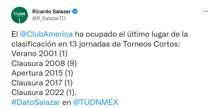 Además, de acuerdo con datos de Ricardo Salazar de TUDN esta es la décimo tercera ocasión que América está en el fondo de la tabla en torneo cortos, ya que sumado al del Clausura 2017 y el Apertura 2015, en el Clausura 2008 durante 9 jornadas estuvieron en el fondo y antes de eso en el Verano 2001 también tocaron fondo en una jornada.