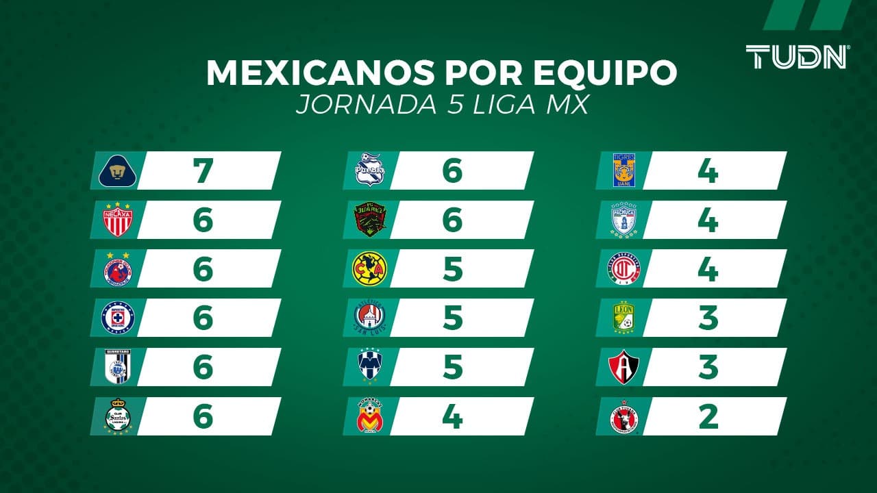 Los conjuntos que meten mayoría de mexicanos por nacimiento son: Puebla, Santos, Gallos Blancos, Cruz Azul, Veracruz, Necaxa y Bravos con 6 jugadores. El Querétaro es líder general en la competencia.