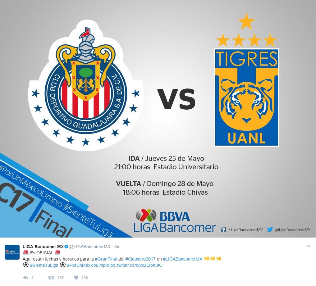 La Liga MX dio a conocer los horarios de los juegos de la gran final del Clausura 2017 entre las Chivas del Guadalajara y los Tigres de la UANL.