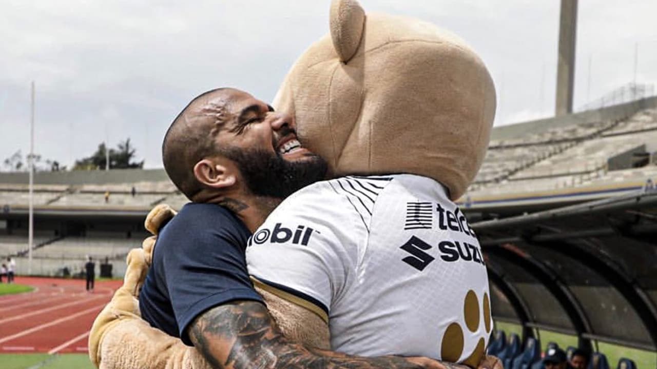 Dani Alves abraza a Goyo, la mascota de los Pumas.